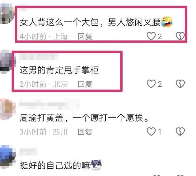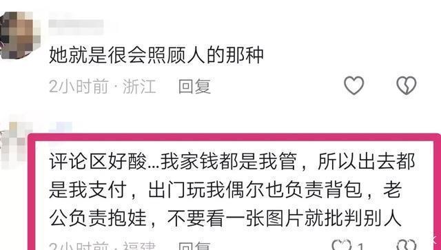 不过,也有网友表示:我家的钱都是我管,所以出去玩都是我支付,偶尔也会负责背包,老公负责抱娃,大家还是别因为一张图片就批判别人了。