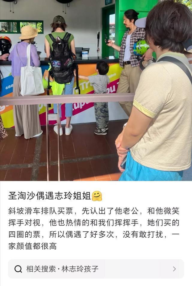 根据偶遇者的描述,林志玲一家三口当天是在排队买票,进入景区游玩。 照片中,穿着一件绿色短袖上衣和蓝色牛仔裤,背着一个黑色双肩包,正在前台买票的正是林志玲。